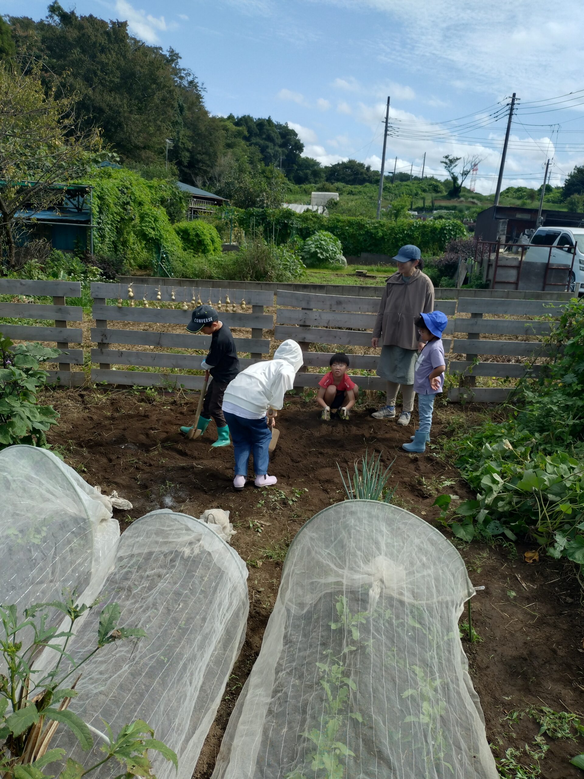 鍬やスコップを使って土を耕すことは最近ではなかなか出来ない体験です。今は耕運機を使い耕します。重い農機具を使って土を耕し土の香りと土の硬さを感じることができたのではないでしょうか。開墾するって大変( ノД`)シクシク…