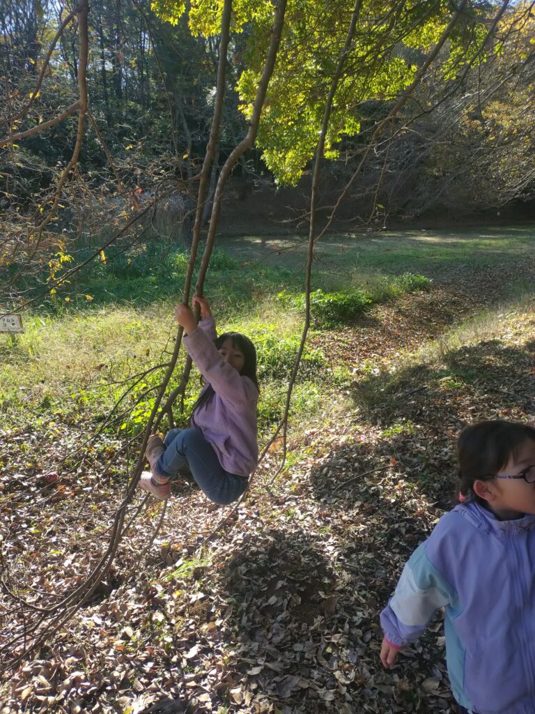 来年度の畑に使用する堆肥づくりのため、落ち葉をかき集めました。広葉樹林がいっぱいあって木登りに夢中になっていました。自然の中から遊びを発見するのはとても良い経験だと思います。