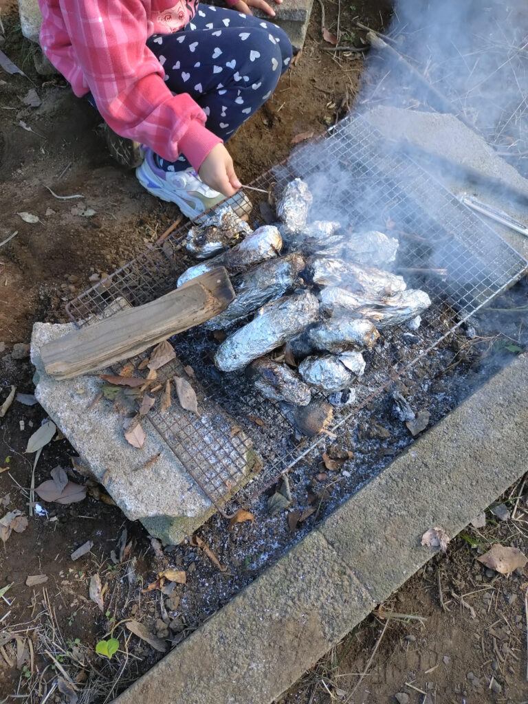 5月にサツマイモの苗を植え付けて10月に収穫し追熟したサツマイモを焼き芋にして食べました。年間を通して活動していることが生かされています。焚火で焼き芋を作ってお外で食べるのは美味しくて気持ちよかったです。