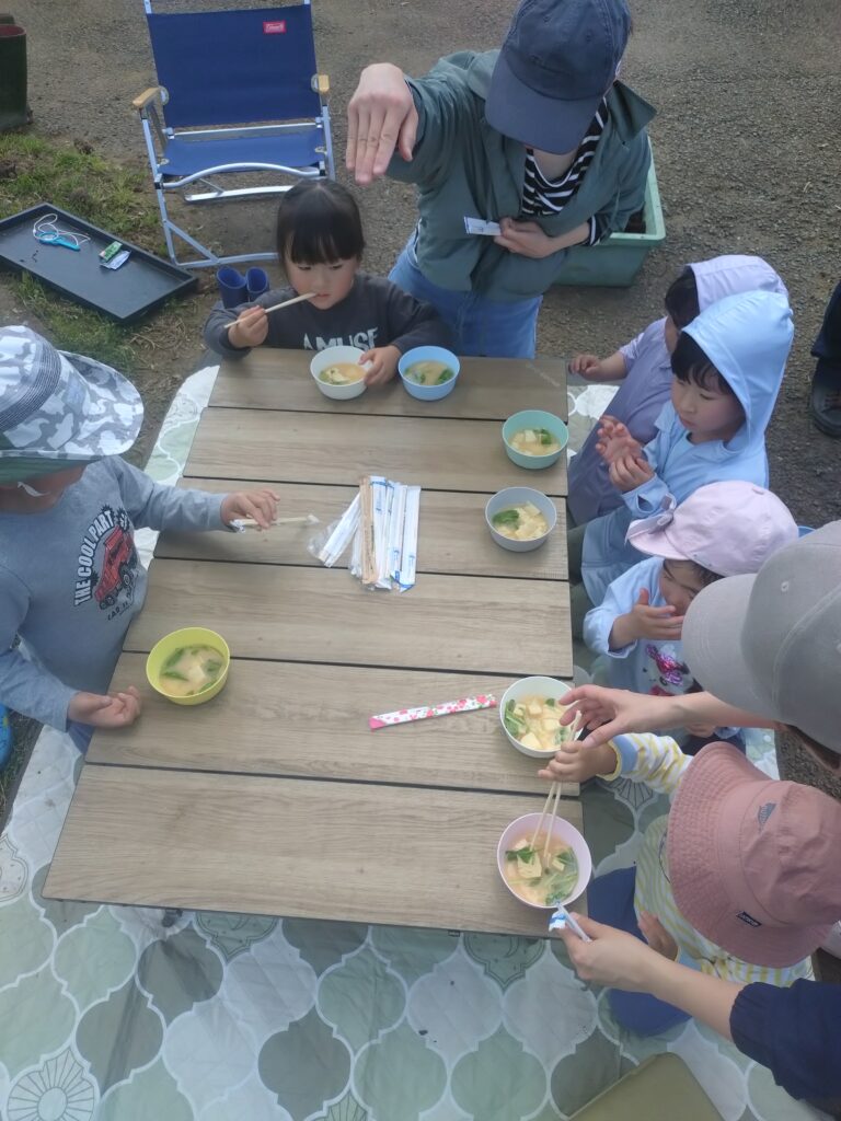筍入りの味噌汁で家では食べない子供が筍を食べたとお母さんはびっくり😲自分たちで作ったからなのかみんなで食べてるからなのか分かりません。