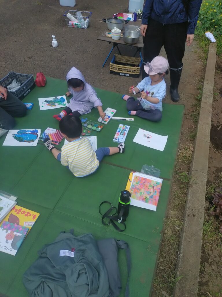 お外で絵具を使うことは親も周りを汚しても安心なので子供たちは思い切って絵をかいていました。